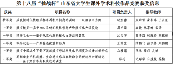 本站讯 5月22日上午,第十八届“挑战杯”·建设银行山东省大学生课外学术科技作品竞赛闭幕式暨颁奖典礼在齐鲁工业大学(山东省科学院)长清校区艺体中心礼堂举办。我校捧得“优胜杯”,1件作品获特等奖,学校获优秀组织奖。
