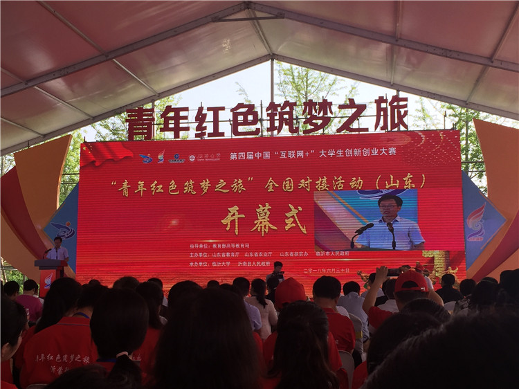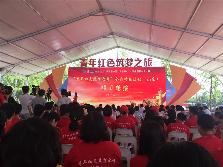 2018年6月30日至7月1日由山东省教育厅、山东省农业厅、山东省扶贫办、临沂市人民政府主办的第四届中国“互联网+”大学生创新创业大赛“青年红色筑梦之旅”全国对接活动(山东)在临沂市沂南县牧马池乡举行。来自全国各地的206个项目团队,近500人参加了活动。由我校创新创业指导中心遴选的 “红色基因永传承”项目(信息与艺术设计系选送)参加了本次活动,并成功与需求方山东广汇集团的负责人进行了现场对接交流,取得了可喜的成果。